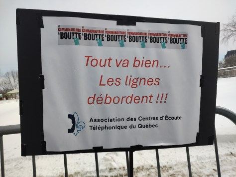 Le 2 avril est également la commémoration Jeudi Saint lorsque Jésus lave les pieds de ses disciples. Quelle belle coïncidence ! La bénévole au kiosque d’accueil m’a expliqué que la couleur rouge signifiait l’URGENCE. Le rouge représente aussi l’élément vital du sang. J’ai donc accroché un ruban rouge à mon poignet. Ce ruban échiqueté représente le FILET SOCIAL EN TRAIN DE S’ÉFRITER, de TOMBER EN MORCEAU, de se DÉCHIRER comme le sang de Jésus versé sur la croix. C’est dramatique !