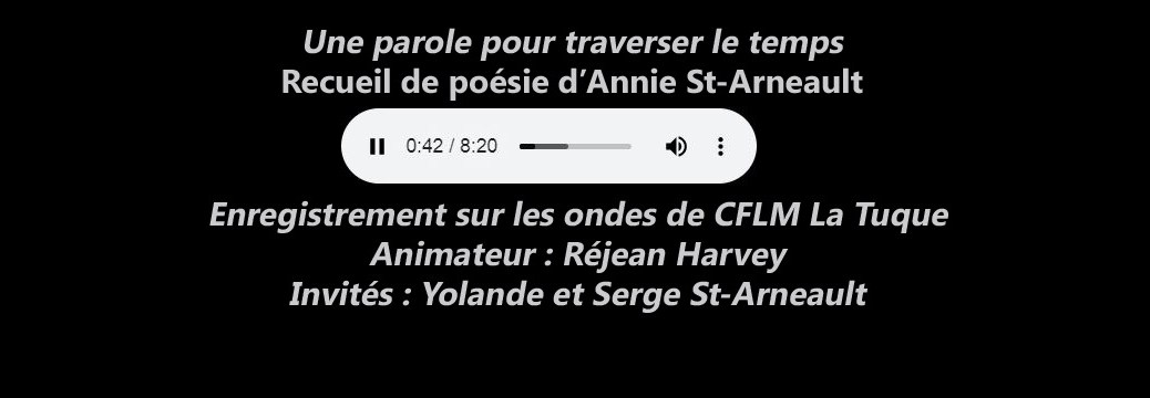Yolande St-Arneault et Serge St-Arneault ont participé sur les ondes de la radio de CFLM de La Tuque à un enregistrement de 8 minutes pour présenter la soirée du récital des poèmes d’Annie St-Arneault. Cet entretien amical grâce à l’animateur Réjean Harvey a aussi permis de présenter non seulement le recueil de poésie, mais aussi le récent livre publié par son fils Serge au sujet de son père Bastien. Veillez cliquer sur le lien suivant :
