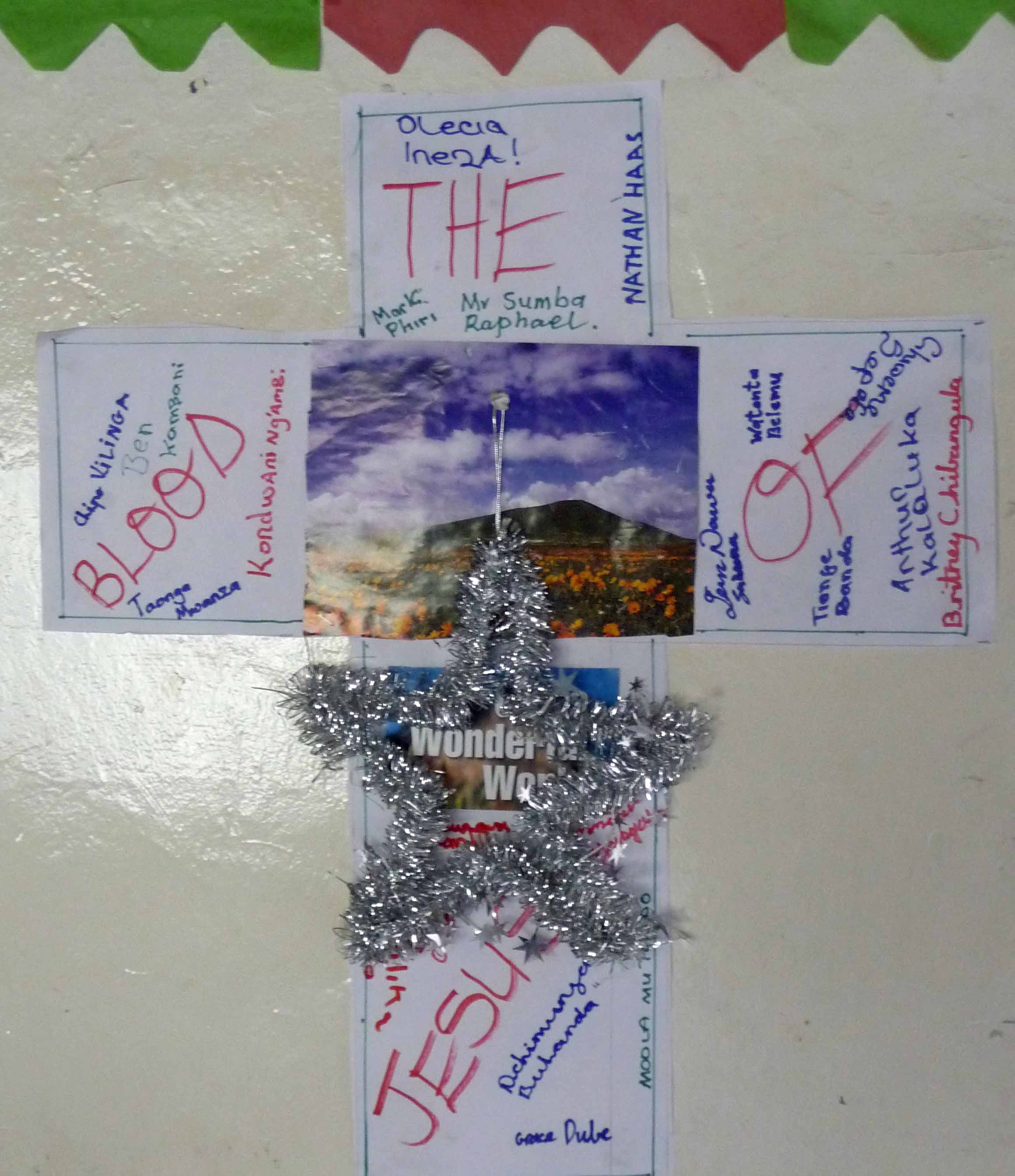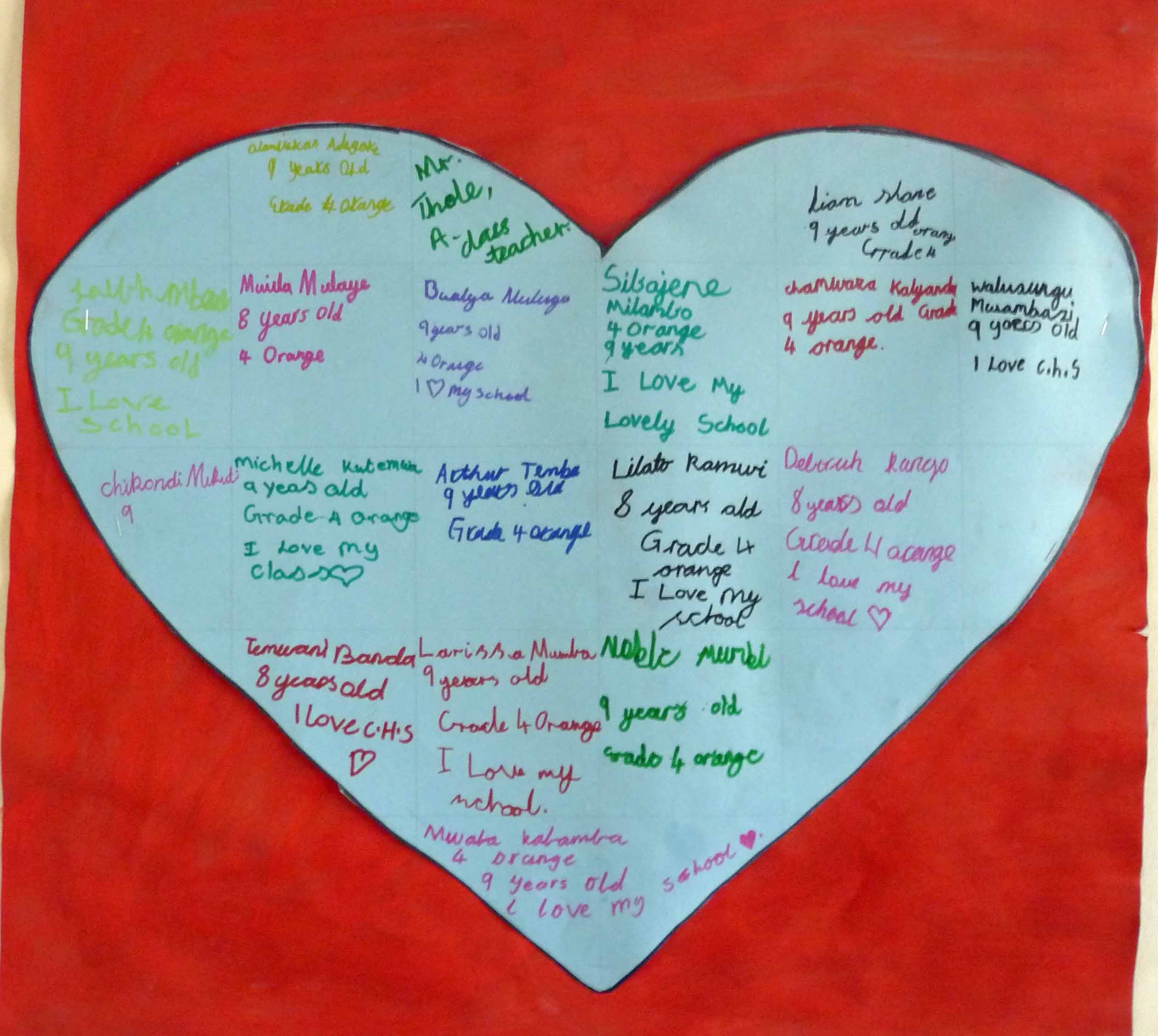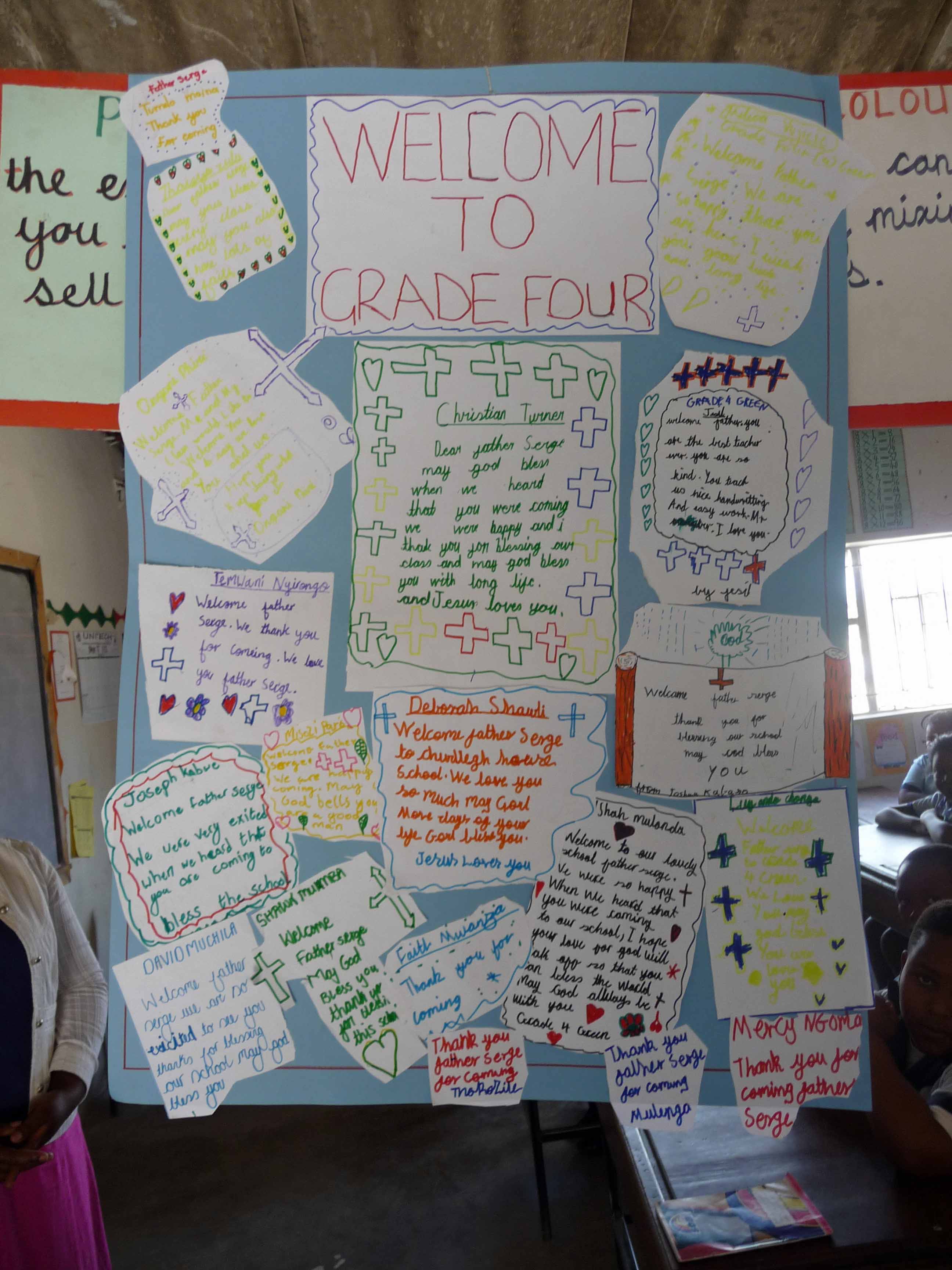 Dans la foulée du 20e anniversaire de l’école de Chudleigh qui a eu lieu en 2013, Mme Petronella Chisanga a demandé aux Missionnaires d’Afrique de bénir l’école. Le père Serge St-Arneault, M.Afr, a répondu à cette invitation en bénissant les élèves de maternel, primaire et secondaire. Au-delà de 600 enfants ont été bénis individuellement sachant bien qu’ils sont déjà bénis par la vie reçue, le soutien familial, celui des enseignants et amis. Avec l’aide des enseignants, chaque classe a créé une affiche en y incorporant les noms des filles et garçons pour symboliser l’unité dans la diversité. Tous et toutes, ainsi que les adultes, sont enfants de Dieu. Notre prière est de préserver la bénédiction donnée en manifestant notre amour mutuel et notre respect.