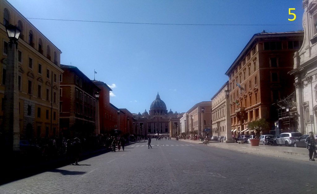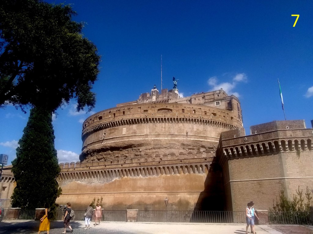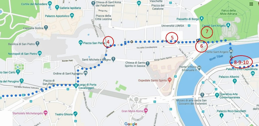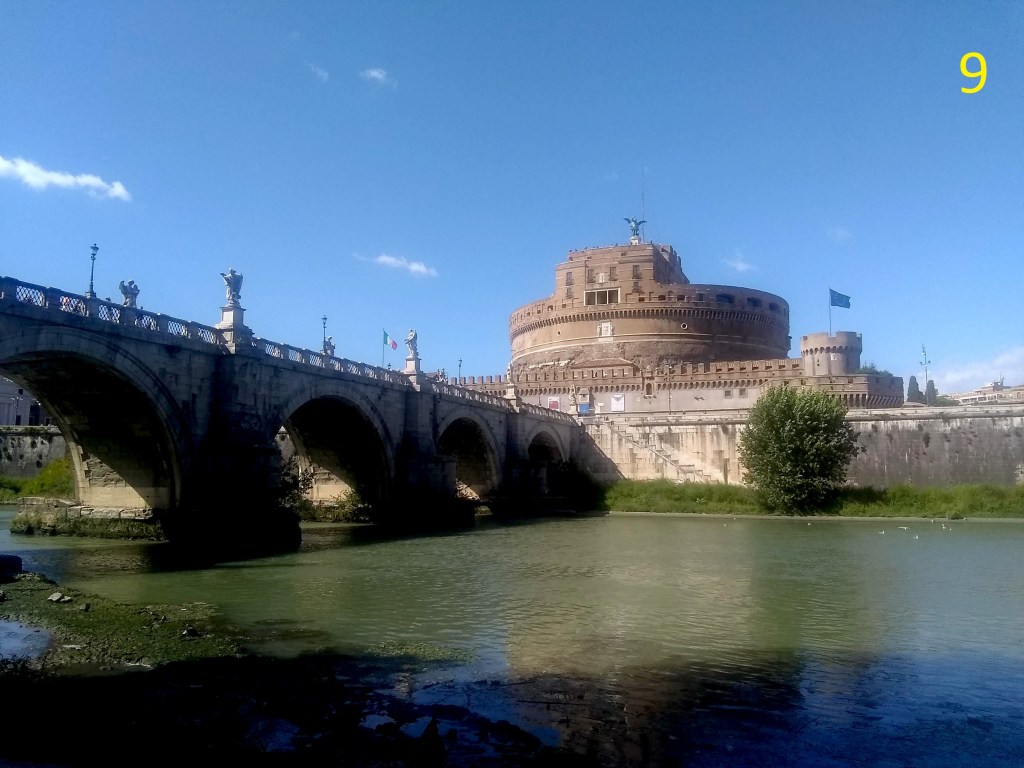 Après une douce descente, il est assez facile de se rendre à la grande place (4) et de poursuivre la route (5) vers le Château Saint-Ange (Castel Sant’Angelo 6-7). Le pont du même nom qui enjambe le Tibre permet de prendre des photos sous un autre angle (8-9-10).