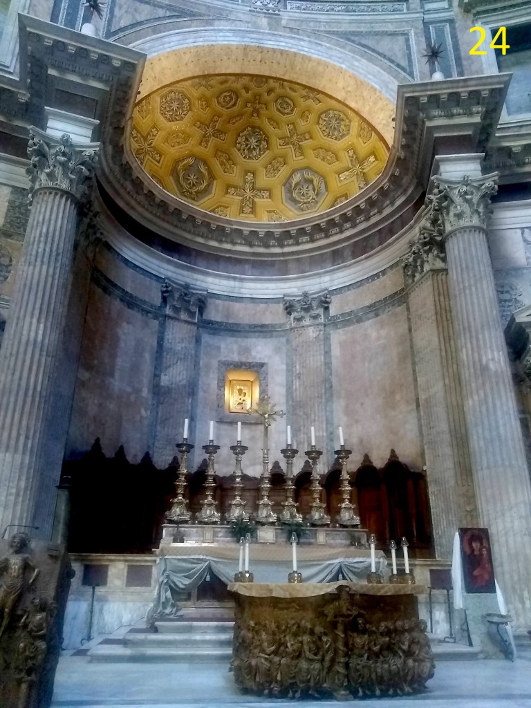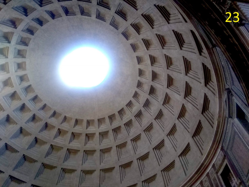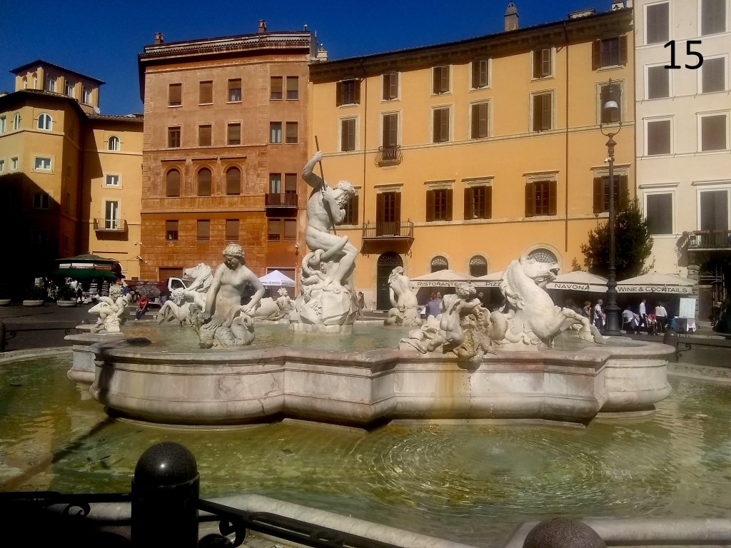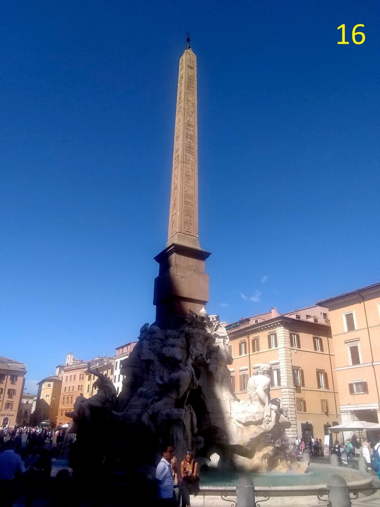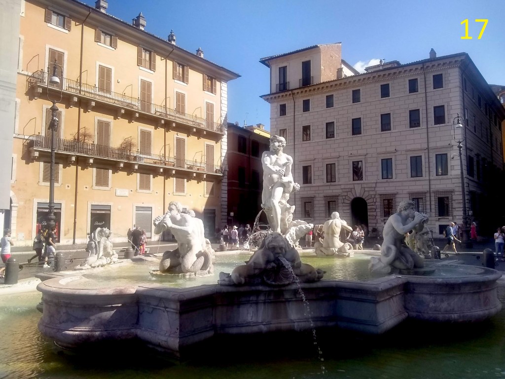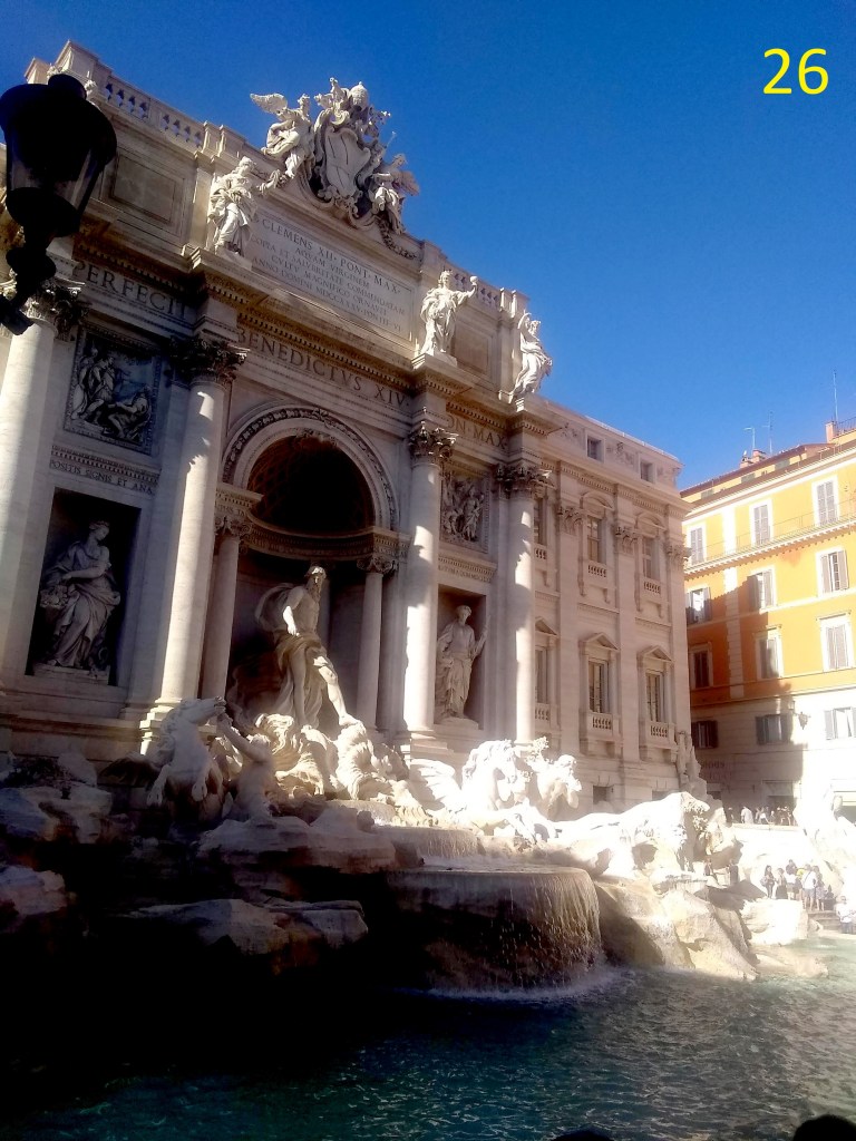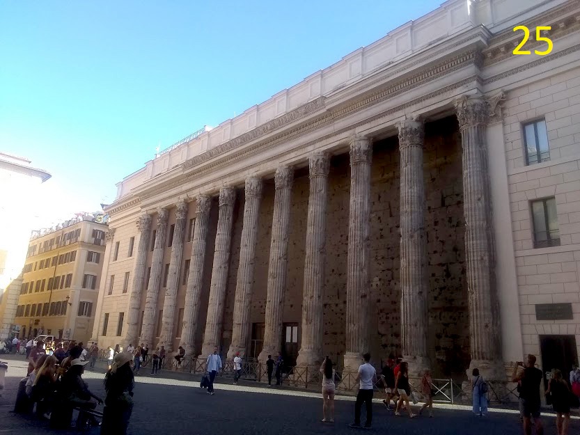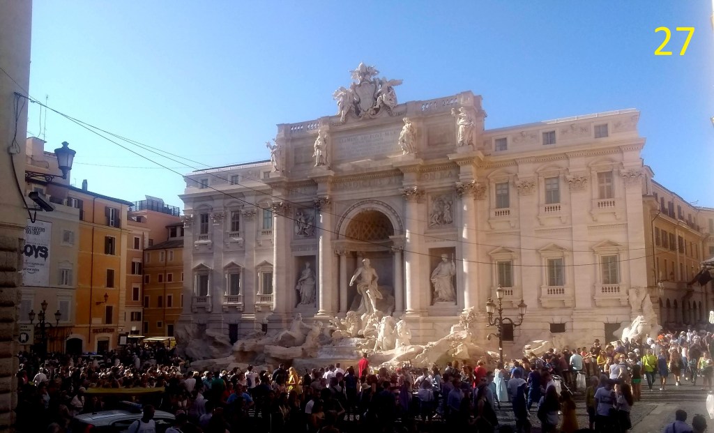 Autres prises de vue (11-12-13) le long de la rivière jusqu’au pont Umberto 1 en direction sud vers la place Navona (14-15-16-17-18). Des rues étroites envahies de touristes (18) mènent à l’incontournable Panthéon (20-21-22-23-24). D’autres ruelles font apparaître les colonnes abîmées du Temple d’Hadrien (25) et finalement la fontaine de Trévi (26-27), un autre lieu incontournable.