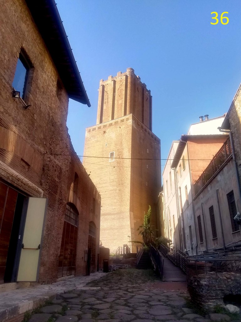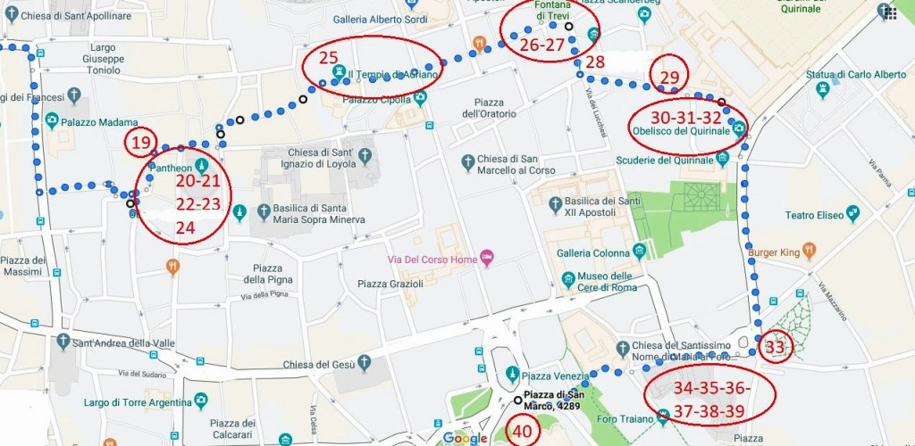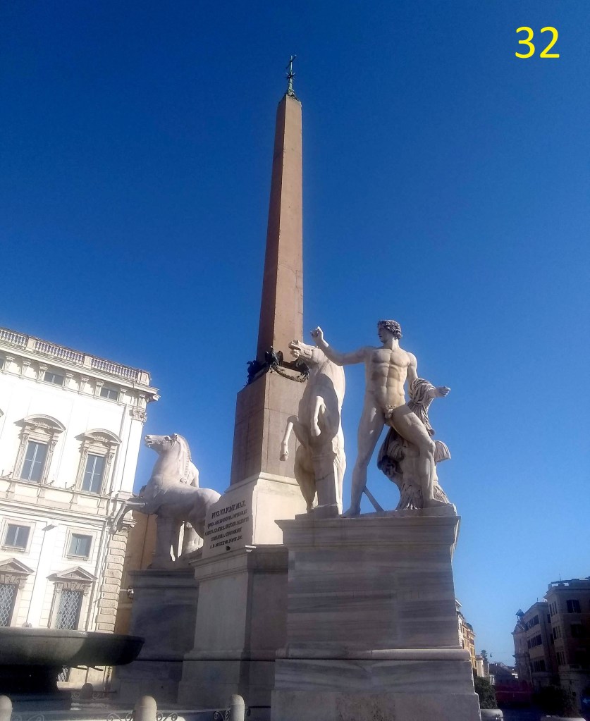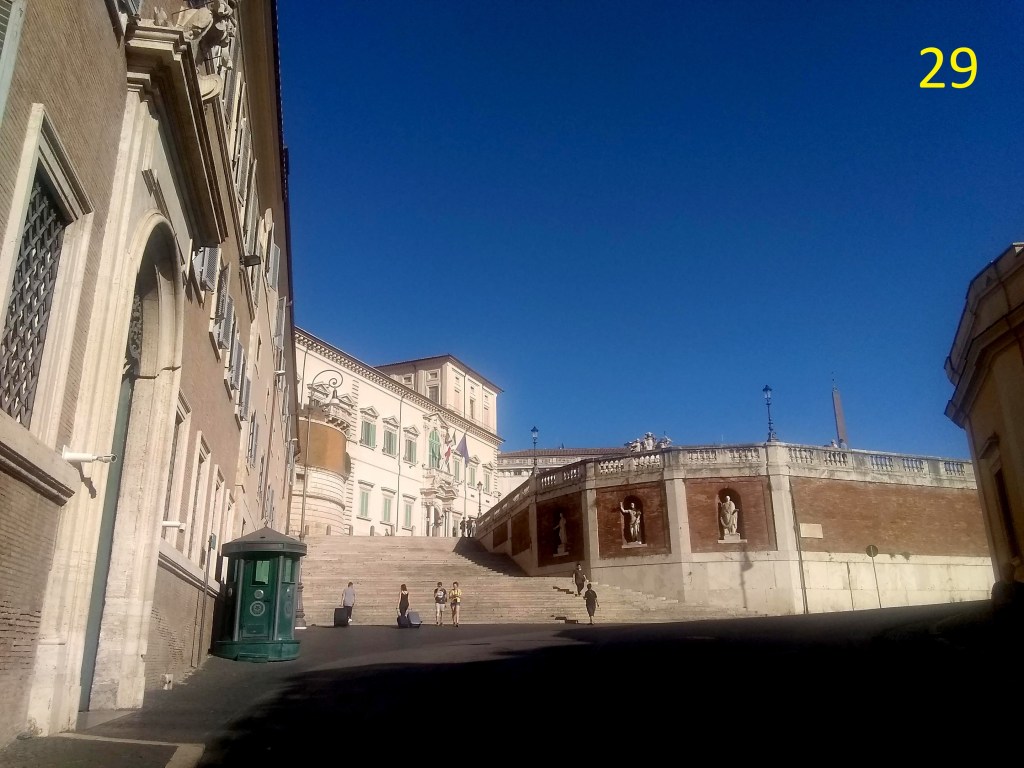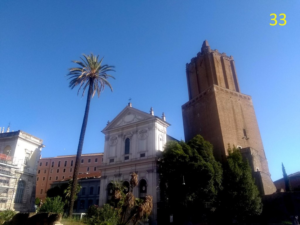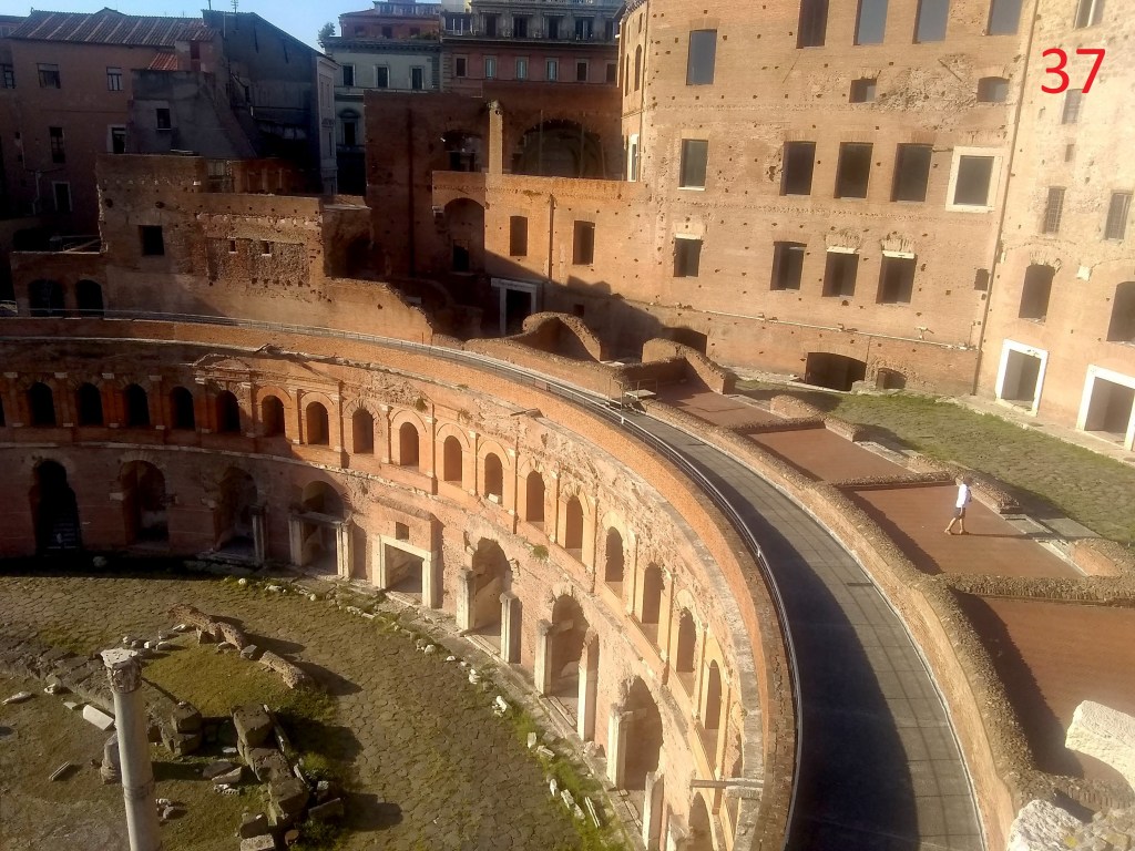 Une autre rue étroite (29) débouche sur une grande esplanade, celle de Quirinal (30-31) avec l’impressionnant obélisque du même nom (32). Finalement, une rue en pente laisse apparaître la Torre delle Milizie ainsi que l’église Santa Caterina a Magnanapoli (32). Je me suis alors dirigé vers les marchés de Trajan, un ensemble de forums romains restauré (34-35-36-37-28-39). J’y suis resté plusieurs heures. Au sujet de cet endroit, j’ai écrit sur ‘Google Map’ que « J’oserais dire que c’est un lieu de méditation sur l’effondrement du super centre d’achat de la Rome antique. Cela devait certainement être très beau et impressionnant à en juger par la qualité des vestiges. »
