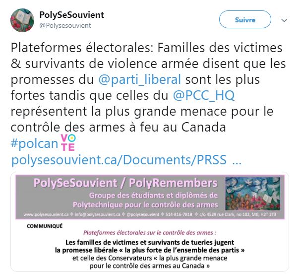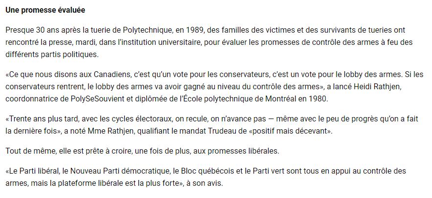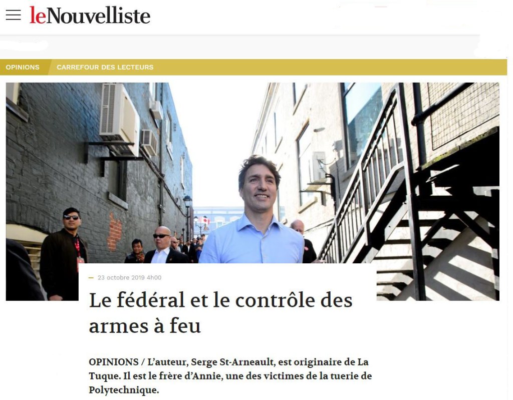 Il faut maintenant espérer que le Parti libéral, qui forme maintenant un gouvernement minoritaire, passe de la parole aux actes concernant la question critique de l’accessibilité des armes d’assaut de type militaire encore légalement vendues au Canada. Souhaitons, si le gouvernement présente des mesures de contrôle plus strict, qu’il puisse compter sur l’appui des partis qui se disaient favorables à de telles mesures.