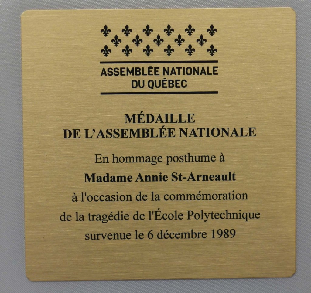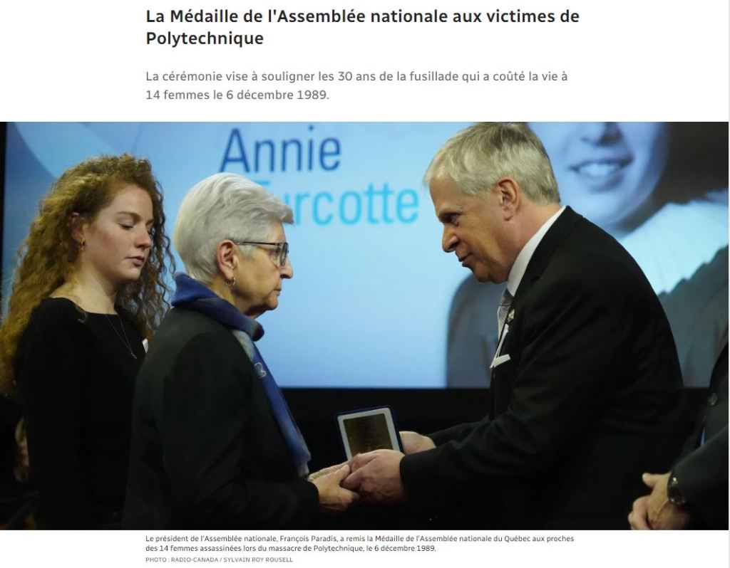 Je suis cette amie d’Annie qui avait choisi d’aller étudier à Québec… ta mere m’en avait fait la remarque… enfin ….j’ai choisi de te contacter en ce jour … Depuis 30 ans les émotions du 6 décembre bien que différentes d’une année à l’autre sont toujours bien vives. J’ai une pensée pour ma meilleure amie.. Je suis heureuse de voir la reconnaissance de l’Assemblée Nationale que vous avez reçu… de la nouvelle inscription sur la place du 6 décembre… il était bien temps!