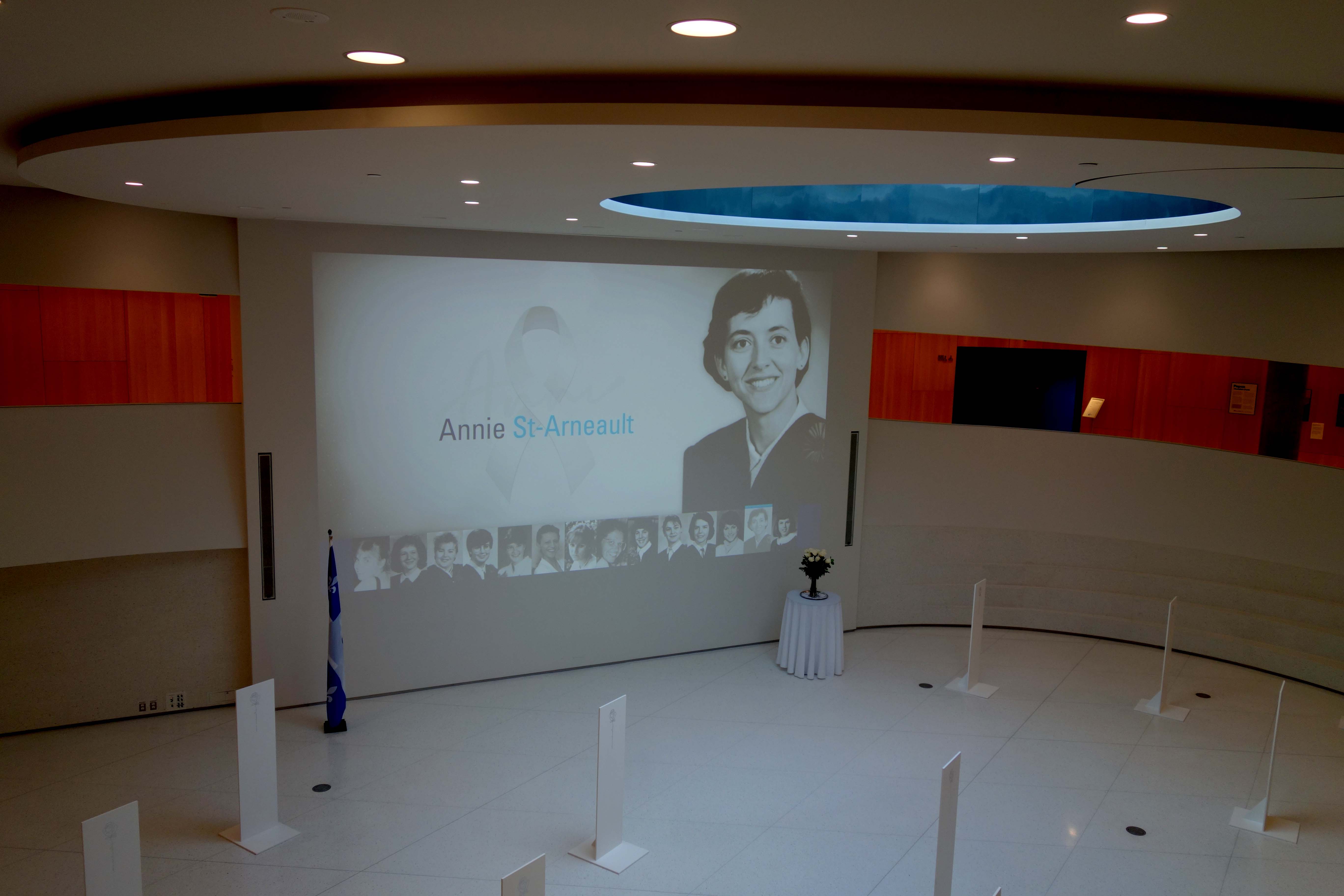 Le service du protocole est déjà prêt à accueillir les membres des 14 victimes de la Poly. Une rotonde aux allures vaticanes ceinture une agora où sont projetées des images. La photo d’Annie apparaît au moment même où je regarde. Défile alors les photos des 13 autres ‘filles’, ainsi fréquemment appelées.