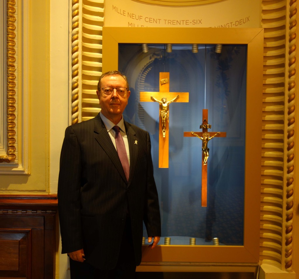 L’ascenseur nous mène alors aux bâtiments de l’Assemblée nationale. Je suis en avance et demande de pouvoir voir le fameux crucifix qui a été enlevé du mur du Salon Bleu. De fait, il y en a deux; celui de 1936 et celui de 1982 qui l’a remplacé. À vrai dire, personne ou presque n’en faisait cas jusqu’au jour où le crucifix a été récemment retiré, le deuxième quoi! L’ironie, c’est qu’ils sont maintenant réunit et plus visible que jamais auparavant. À ne pas manquer si vous visitez les lieux.