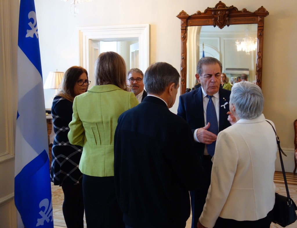 Je descends de l’autobus à la Gare du Palais de Québec tout juste après 11h00. Je mangue un croute, reçoit un appel téléphonique d’une journaliste et prends un taxi vers l’Assemblée nationale. Le tout  nouveau site d’accueil pour visiteurs a fière allure. Comme cela est devenu la règle un peu partout, la présence policière est visible partout.