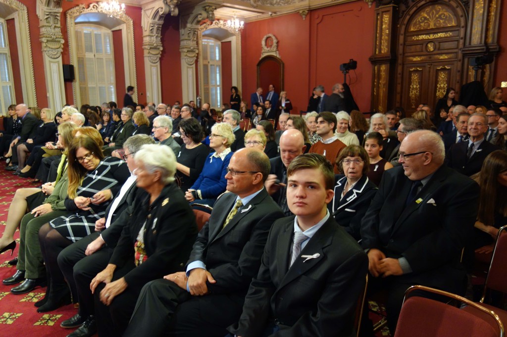 Au son d’un quatuor à corde (de fait, elles étaient trois), chaque famille a ensuite reçu une médaille de l’Assemblée nationale à titre posthume.  Finalement, une rose blanche a été déposée sur une table par tous les dignitaires présents et les membres de famille. En m’approchant de la table, j’ai levé la tête et revu la photo d’Annie projetée sur l’écran. J’ai alors embrassé la rose!