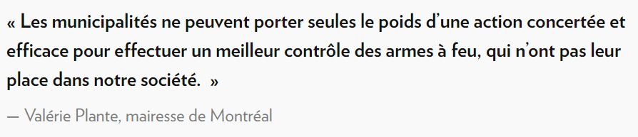« En mai dernier, le gouvernement fédéral a légiféré dans le dossier des armes d’assaut. J’invite les élus de la Chambre des communes à poursuivre le travail amorcé et [à] inclure rapidement les armes de poing », a-t-elle ajouté.