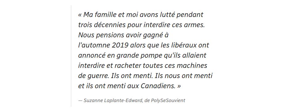 Nous ne sommes pas des cruches pour imaginer que les propriétaires d’armes d’assaut vont simplement garder leurs armes en souvenir des jours où ils pouvaient les utiliser. Ils savent très bien qu’un éventuel gouvernement conservateur dirigé par O’toole annulerait l’interdiction. Ce faisant, nous nous retrouverons encore une fois à la case de départ dans notre lutte. L’idéologie de la National Rifle Association des États-Unis s’imposera ainsi dans notre pays. Ce sera alors la fin de notre combat qui a débuté il y a plus de trente ans.