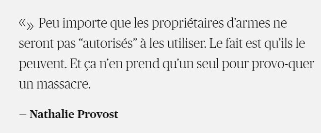 «Nous ne sommes pas des cruches pour imaginer que les propriétaires d’armes d’assaut vont simplement garder leurs armes en souvenir des jours où ils pouvaient les utiliser. Ils savent très bien qu’un prochain gouvernement conservateur dirigé par O’Toole annulera l’interdiction. Ce faisant, nous nous retrouverons encore une fois à la case de départ dans notre lutte. L’idéologie de la National Rifle Association des États-Unis s’imposera ainsi dans notre pays. Ce sera alors la fin de notre combat qui a débuté il y a plus de trente ans», écrit M. St-Arneault dans une lettre ouverte envoyée au Nouvelliste.