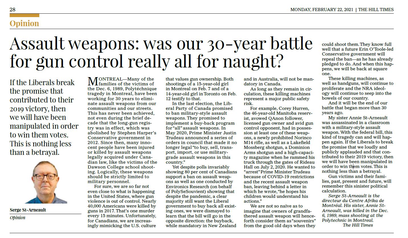 Many of the families of the victims of the December 6, 1989, Polytechnique tragedy in Montreal, have been working for thirty years to eliminate assault weapons from our communities and our streets. This has never been achieved, not even during the brief decade that the long-gun registry was in effect, which was abolished by Stephen Harper’s Conservative government in 2012. Since then, many innocent people have been injured or killed by assault weapons legally acquired under Canadian law, like the victims of the Dawson College school shooting. Logically, these weapons should be strictly limited to military personnel.