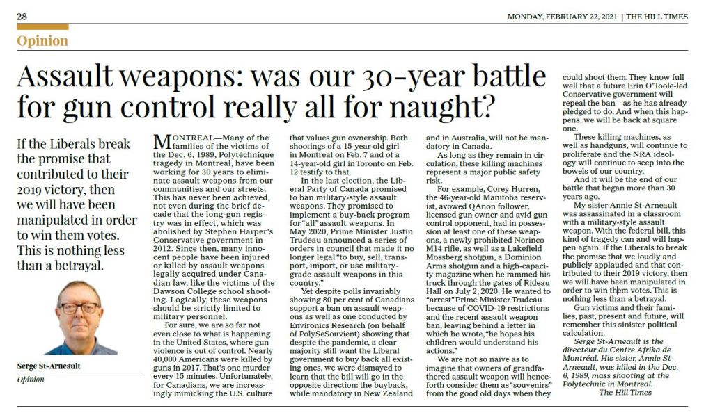 My sister Annie was assassinated in a classroom with a military-style assault weapon. With the anticipated federal bill, this kind of tragedy can and will happen again. If it is indeed the intent of the Liberals to break the promise that we loudly and publicly applauded and that contributed to their 2019 victory, then we will have been manipulated in order to win them votes. This is nothing less than a betrayal.