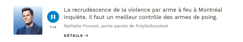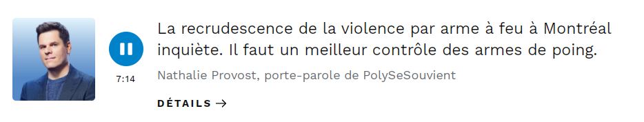 «Si chacun de vos auditeurs envoyait un courriel à M. Trudeau pour dire que les armes de poing doivent être contrôlées, moi je crois que nos gouvernements agiraient. Mais on ne le fait pas parce qu’on le tient pour acquis»