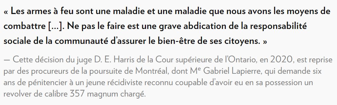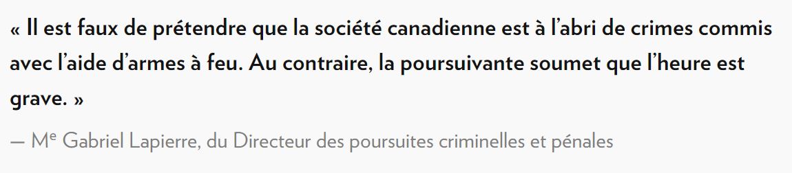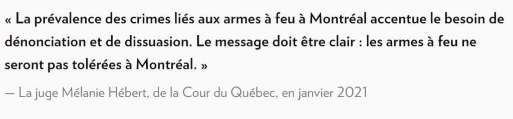 « Souvent, on a des victimes collatérales qui seront exposées parce qu’on se retrouve avec des gens blessés par balles dont on ne peut pas conclure qu’ils étaient visés par les évènements. On a des projectiles qui se retrouvent dans des logements privés, des tirs au travers de façades de maisons ou de commerces, ou sur des scènes de rassemblements de jeunes », a décrit l’enquêteur Marc-André Dubé le 18 janvier dernier, lors des plaidoiries sur la peine d’un récidiviste de 26 ans qui a plaidé coupable à une accusation de possession d’une arme à feu prohibée chargée.
