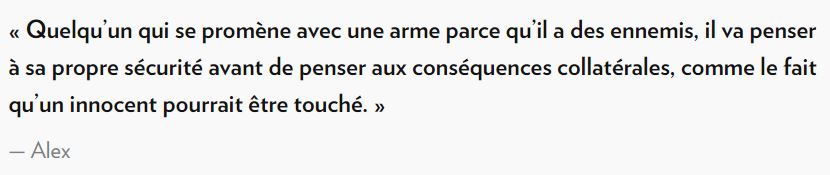 Et les conflits, d’où viennent-ils ? Alex évoque les guerres d’ego entre quartiers et les conflits interpersonnels qui se seraient autrefois réglés à coups de poing, mais conduisent aujourd’hui à des fusillades vu l’accessibilité des armes. Il parle aussi de la compétition pour le profit, à travers diverses activités criminelles, chez des jeunes qui ont grandi en milieu défavorisé.