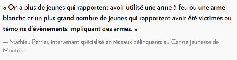 Alex, de son côté, a l’impression que les armes de poing sont devenues plus accessibles pour les adolescents. « Les tranches d’âge ont descendu. Tu peux trouver des gars de 14-15 ans avec une arme. Les prix ne sont pas hors norme. Pour une arme “sale”, déjà utilisée, c’est entre 800 $ et 1200 $ », dit-il.