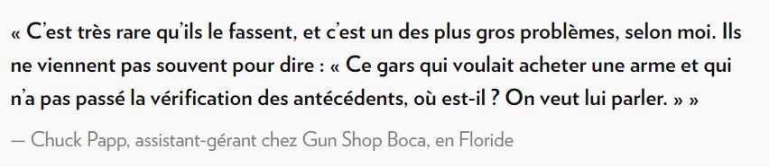 Chuck Papp est assistant-gérant chez Gun Shop Boca, armurier de Boca Raton, en Floride, où Naomi Haynes avait acheté une partie des armes envoyées au Canada. Il souligne que les acheteurs doivent se soumettre à une vérification de leurs antécédents et signer un document officiel où ils jurent que l’achat n’est pas fait pour une tierce personne. Mais beaucoup de criminels essayent de contourner les contrôles.