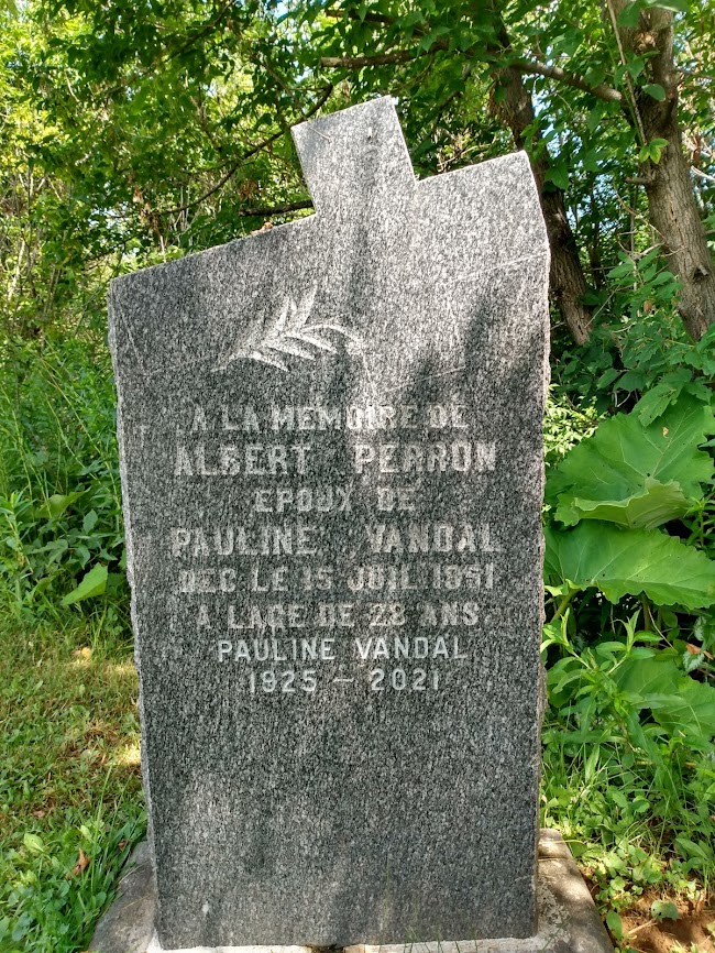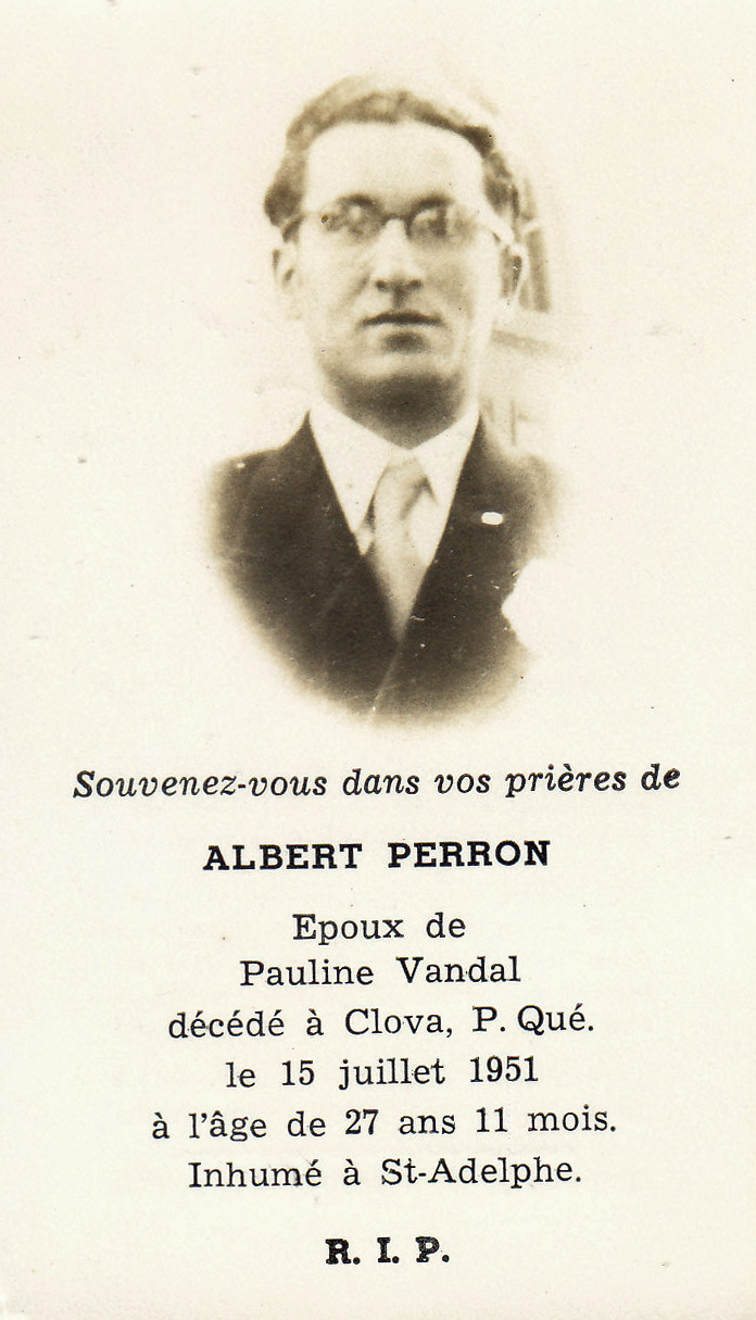 Albert Perron s’était marié avec Pauline Vandal le 16 juillet 1949, soit deux ans presque jour pour jour avant l’accident. Leur fils Michel-Eritha est né le 5 mai 1950. Tante Pauline a toujours fait partie de la famille des Perron malgré son veuvage. Je lui ai souvent rendu visite en compagnie de mes parents. Elle est même venue à La Tuque avec son second mari, Armand Plamondon.