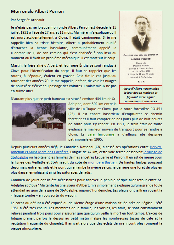 Je n’étais pas né lorsque mon oncle Albert Perron est décédé le 15 juillet 1951 à l’âge de 27 ans et 11 mois. Ma mère m’a expliqué qu’il est mort accidentellement à Clova. Il était camionneur. Si je me rappelle bien sa triste histoire, Albert a probablement oublié d’attacher la benne basculante, communément appelé la « dompeuse », de son camion qui s’est abaissée à son insu au moment où il fixait un problème mécanique. Il est mort sur le coup.