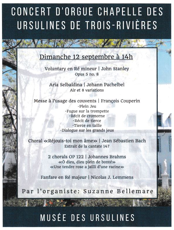 En ce dimanche du 12 septembre 2021, les portes étaient toutes ouvertes dans le cadre des Journées du Patrimoine Religieux. Un concert d’orgue se tenait à 14h00 dans la grande chapelle. Une petite assemblée s’y est retrouvée. L’auditoire a apprécié les pièces jouées par Suzanne Bellemare. Le répertoire comprenait John Stanley, Aria Selbaldina et Johann Pachelbel, François Couperin, Jean Sébastien Bach, Johannes Brahms et Nicolas J. Lemmens. L’ensemble mélancolique de ces œuvres a été interrompu par le grand classique de Bach; extrait de la cantate 147.