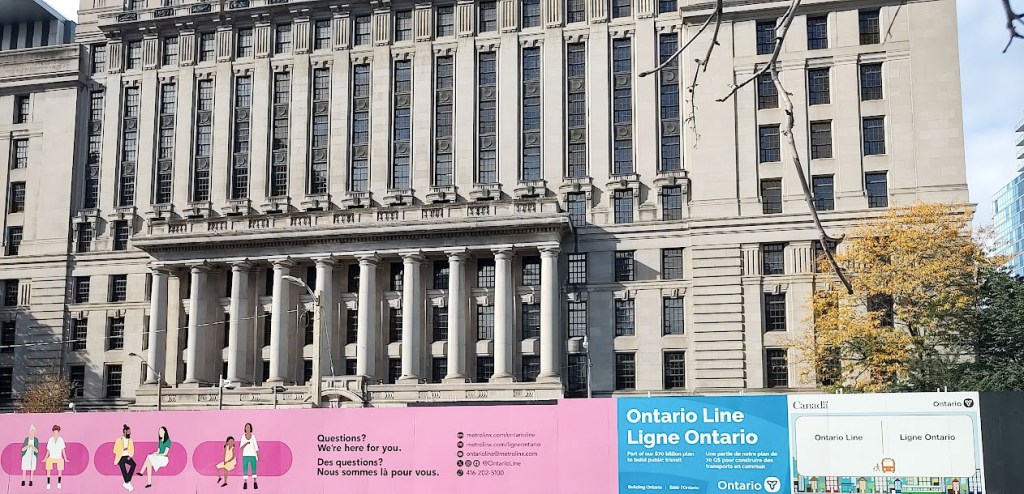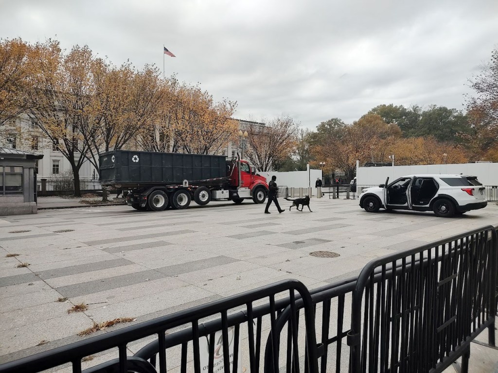 Je comprends que les travaux imposés par le président Trump se déroulent sur la façade est, donc à gauche. Des panneaux blancs masquent la scène, ne laissant percer que le bruit des marteaux-piqueurs.