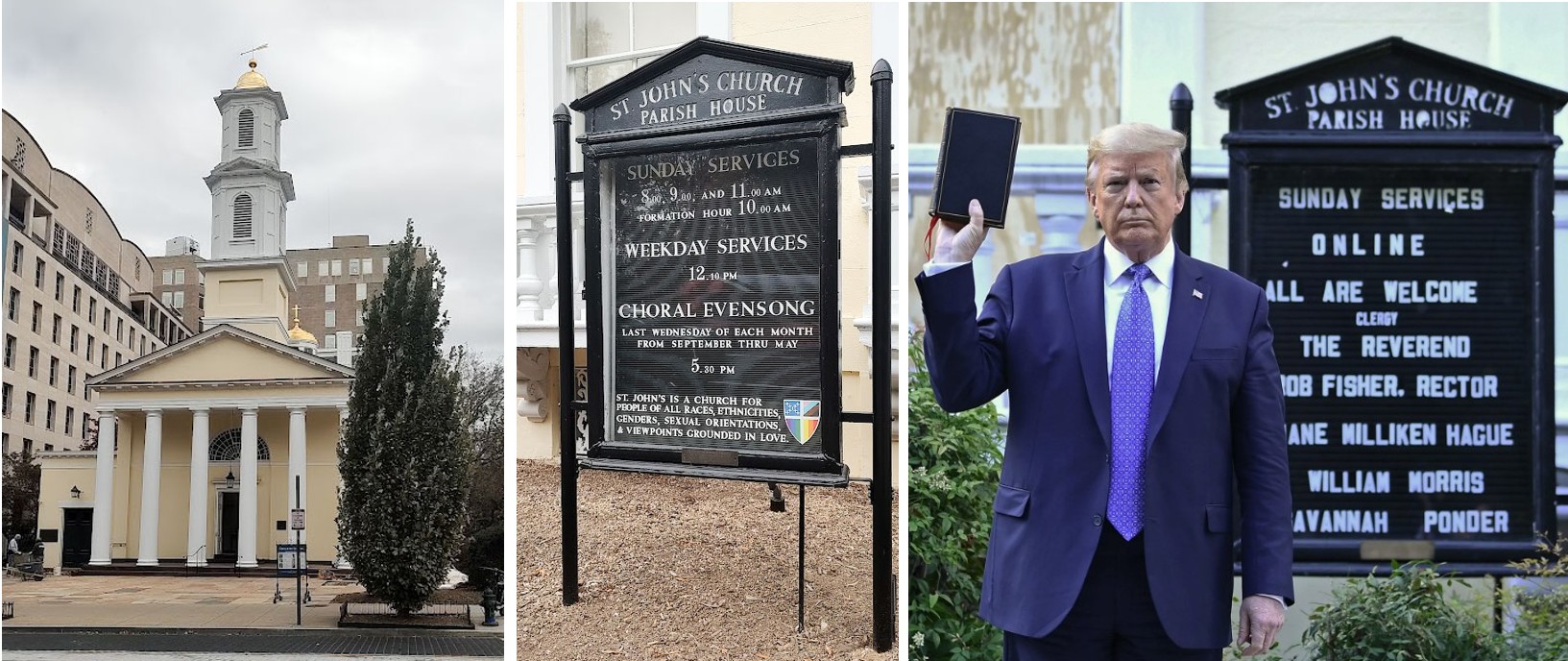 Je reconnais l’église épiscopale St John au coin de la 16e rue NW et de H Street NW, également connue sous le nom d’« église des Présidents ». Elle se distingue par ailleurs par son engagement envers la justice sociale, le soutien aux minorités, et par ses actions en faveur de la réconciliation raciale. Le 1er juin 2020, l’église a fait les gros titres lors de la visite de Donald Trump, qui s’est rendu à cette église pendant les manifestations suivant la mort de George Floyd.