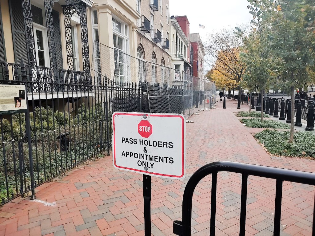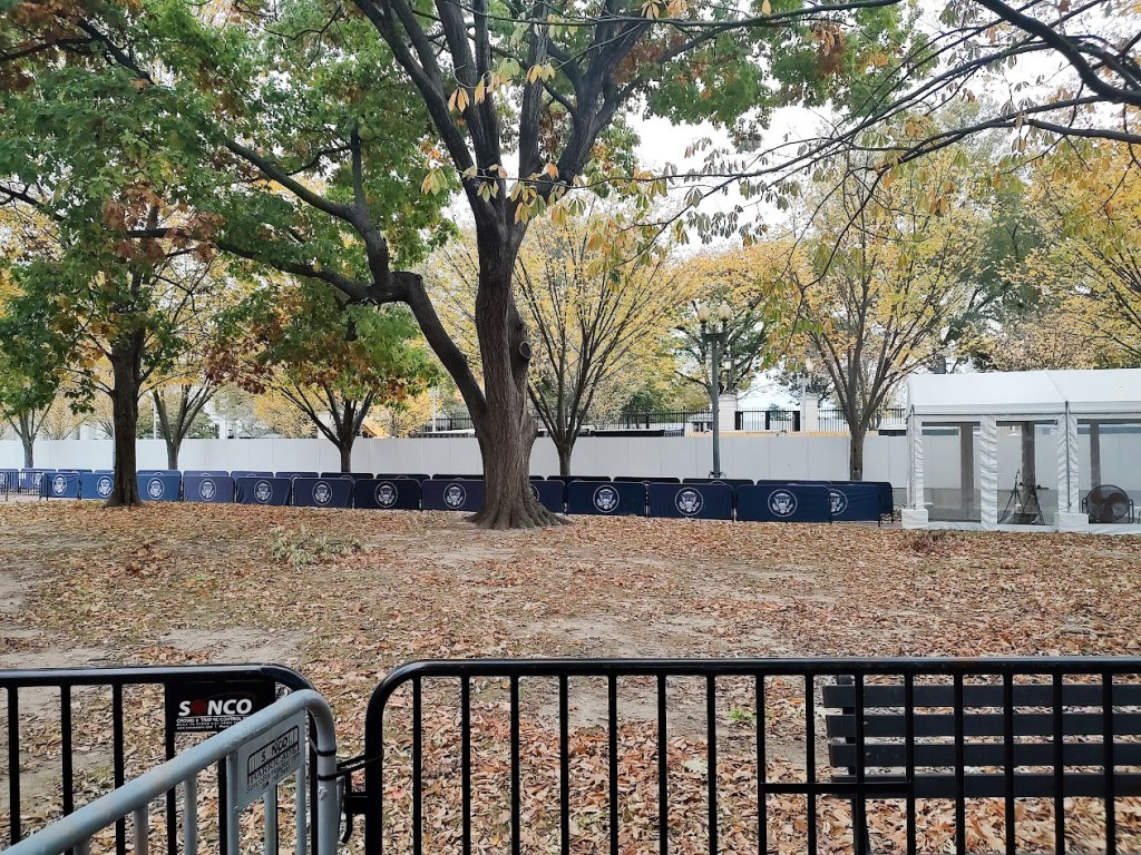 Le Lafayette Square est remarquablement paisible. Le ciel est nuageux. Comme l’année dernière, il est impossible de s’approcher de la grille principale sur l’avenue Pennsylvanie. La présence policière et des clôtures supplémentaires limitent l’accès.