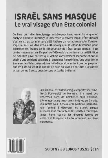 Le lancement du livre de Gilles Bibeau sur Israël. Titre de cette brique de 500 pages (vraiment une encyclopédie sur le sujet, passionnante à lire), « ISRAËL SANS MASQUE. Le vrai visage d’un État colonial ». Édité en Tunisie par les Éditions Tamam et au Canada par Sikelli, la maison d’édition de la librairie Port de Tête (proche du métro Mont-Royal) de Montréal.