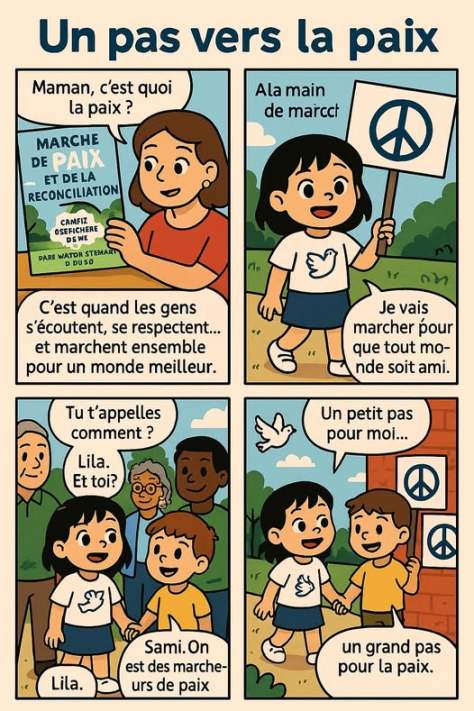 Comme la montre si joliment notre bande dessinée, la paix commence par l’écoute, le respect et la volonté de construire un monde meilleur ensemble. C’est exactement ce que nous célébrerons lors de la 4e édition de la Marche de la Paix et de la Réconciliation !