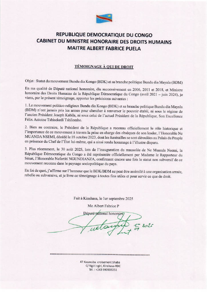 En conférence de presse, Me Lumbala Kabeya n’était pas peu fier de brandir une preuve de taille, soit un témoignage signé par le député Albert Fabrice, ministre des Droits de la personne de la République démocratique du Congo de 2021 à 2024, qui confirme que non seulement le BDK et sa branche politique n’ont « jamais pris les armes pour chercher à renverser le pouvoir établi » mais, qu’au contraire ce mouvement politico-religieux a plutôt joué un rôle historique reconnu par l’actuel président lui-même, Félix Tshisekedi. Des funérailles nationales ont même été offertes au chef du BDK en 2023.