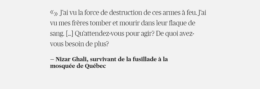 De quoi s’agit-il donc? En vertu de la nouvelle loi 64 sur l’immatriculation des armes à feu, toute arme à feu sur le territoire du Québec doit être immatriculée avec un numéro unique et inscrite à un fichier. Les transactions devront être signalées et l’arme pourrait être saisie en cas d’infraction. De toute évidence, et cela a été sans cesse répété, Poly se souvient n’est pas contre les propriétaires d’armes, ni contre la chasse, ni contre le tir sportif. Tout ce qui est demandé est la mise en place d’un système de contrôle raisonnable d’objets qui sont d’abord conçus pour tuer. Les proarmes s’acharnent à dénoncer ce registre des armes à feu en imaginant qu’il y a là un «contrôle excessif». Voilà l’erreur! Il n’y a rien d’excessif à mettre en place des lois civilisées pour protéger les vies humaines. Il y a beaucoup de lois imposées aux propriétaires de voiture pour assurer la sécurité publique. Nous comprenons tous que c’est pour notre protection même si on chiale de temps en temps. On sait que c’est pour notre bien.