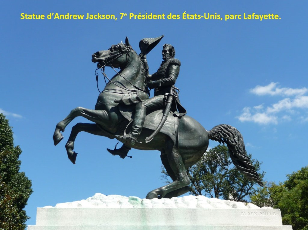La ville de Washington est peuplée de nombreuses statues, les unes plus fameuses que les autres. Mais les quelques heures que j’y ai passées le 22 août dernier en route vers Montréal m’ont seulement permis de croiser les moins connues; celles d’Andrew Jackson (7e Président des États-Unis) et de l’Amiral David G. Farragut (érigée par le Président James A. Garfield, 20e Président Américain).