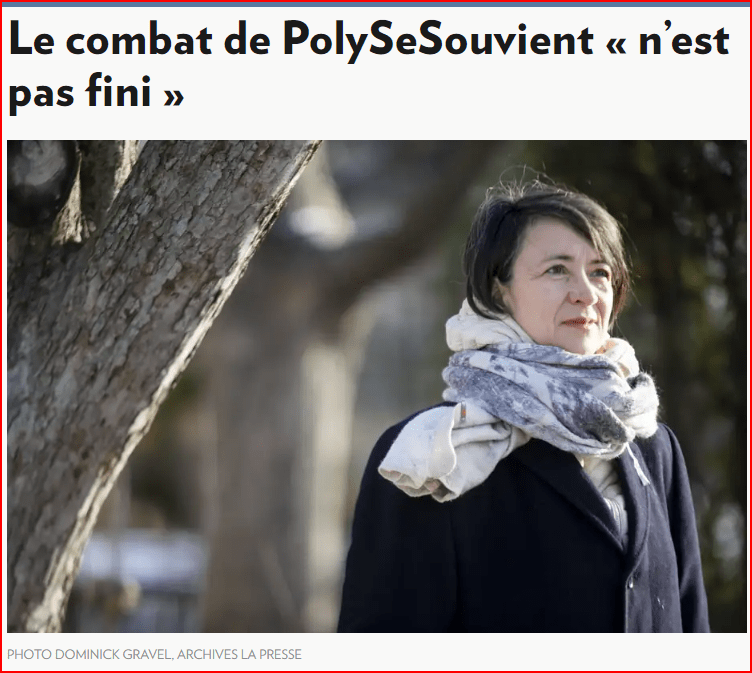Le travail d’intérêt public de PolySeSouvient a pour objectif de soutenir une réflexion soutenue auprès du public et pousser nos gouvernements à légiférer pour un meilleur contrôle des armes à feu au Québec et au Canada. Heidi Rathjen, Nathalie Provost et leur petite équipe de soutien se sont investis dans cette cause depuis 34 ans !