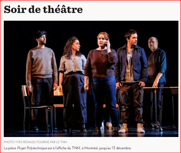 Projet Polytechnique est présentée du 14 novembre au 13 décembre au Théâtre du Nouveau Monde.