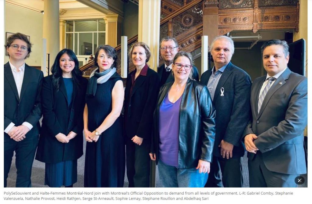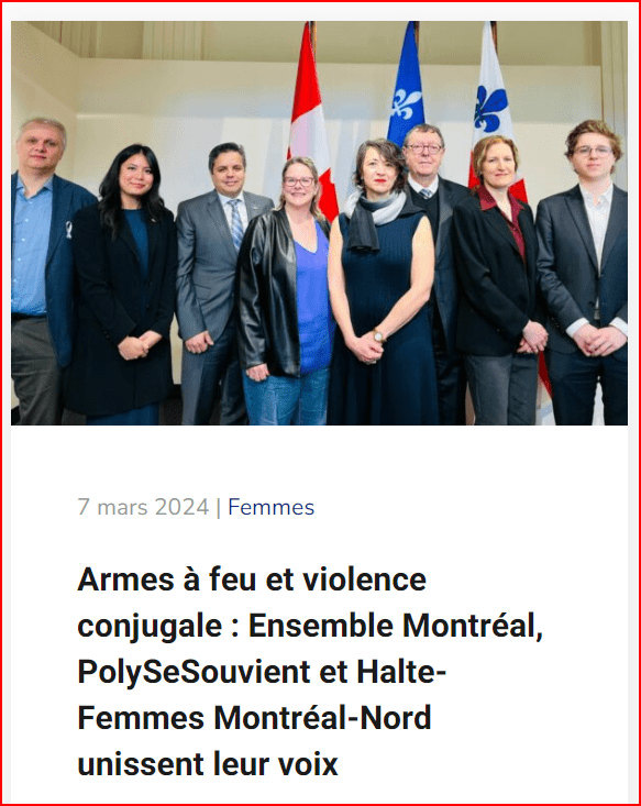 Comme en 2019, PolySeSouvient était présent lors d’une conférence de presse tenue à l’Hôtel de Ville de Montréal et organisée par le parti municipal Ensemble Montréal à l’occasion de la Journée mondiale des droits des Femmes. Le but de ce rassemblement était de réclamer une plus forte réglementation et des protocoles efficaces en lien avec la problématique de la violence conjugale, en plus d’interdire les armes d’assaut et d’introduire d’autres mesures pour venir en aide aux victimes.