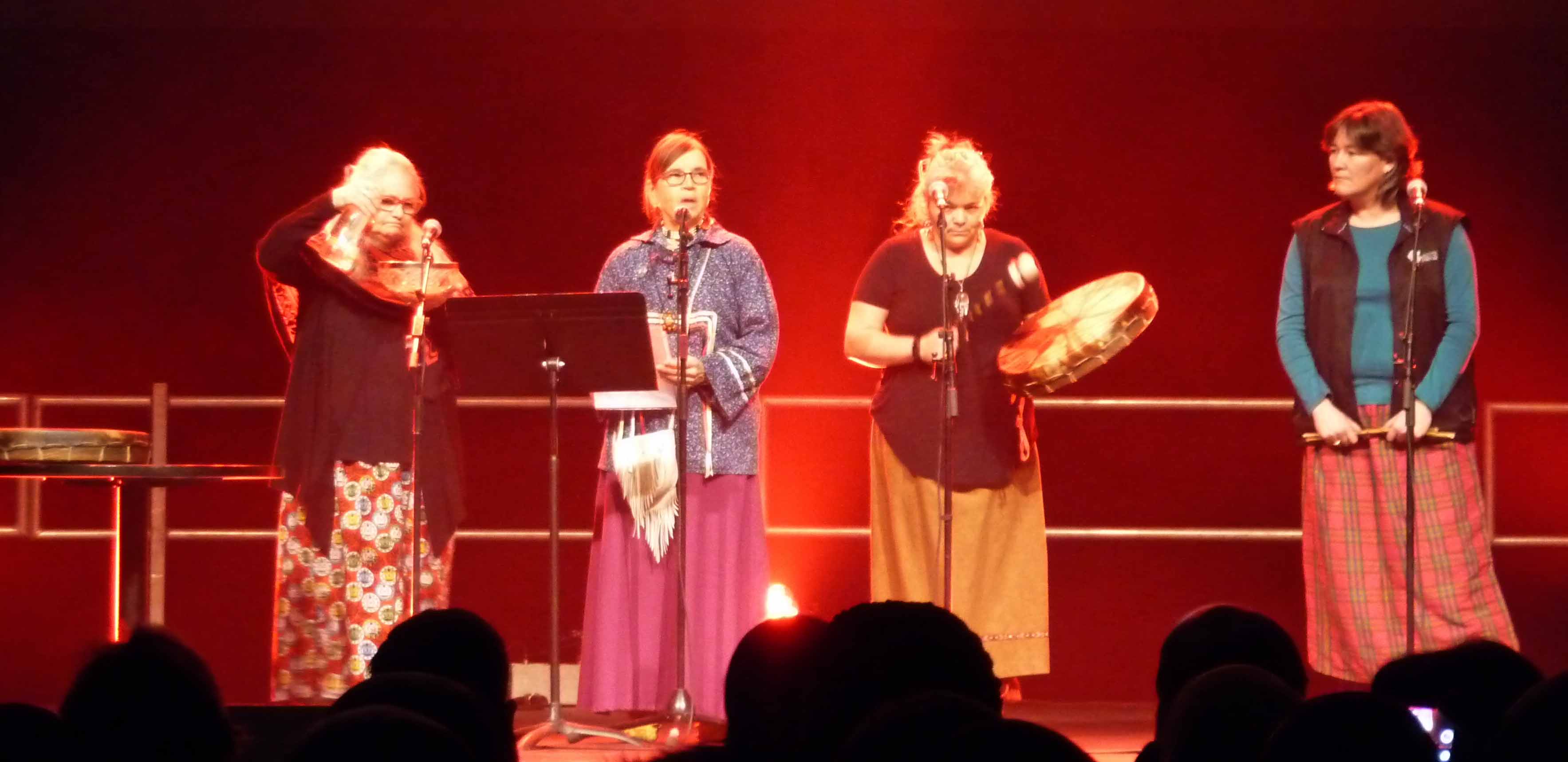 Les animatrices invitent ensuite Édith Picard, aînée de la nation huronne-wendat de Wendake, à prendre la parole. Dans son mot de bienvenue, elle souhaite que la cérémonie soit pleine de quiétude. Ce ne sera pas tout à fait ce qui arrivera.