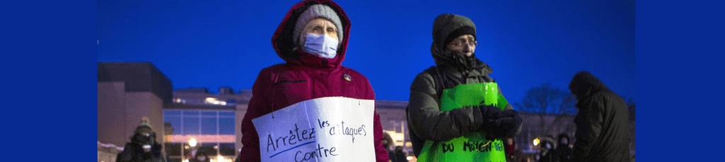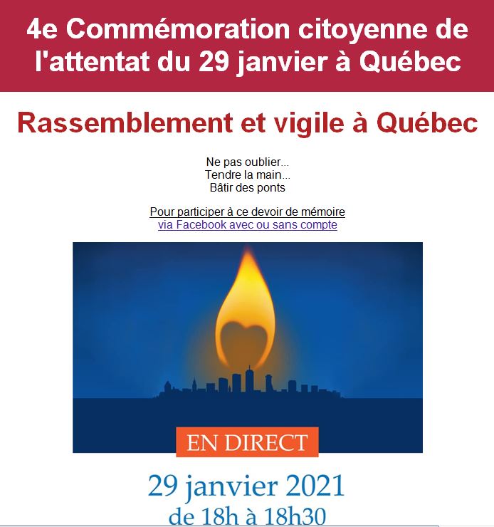 Cette solidarité qui nous accompagne depuis sept ans est une immense richesse ; avec les familles et les proches des victimes, entre les différentes confessions religieuses de la ville de Québec, avec la Nation huronne-wendat et les autres peuples autochtones des territoires voisins, avec l’École Polytechnique de Montréal, la communauté de London en Ontario, la synagogue de Pittsburgh aux États-Unis, la mosquée de Christchurch en Nouvelle-Zélande et d’autres. Nous soulignons la présence solidaire de Heidi Rathjen et Serge St-Arneault de PolySeSouvient. Merci d’être avec nous ce soir.