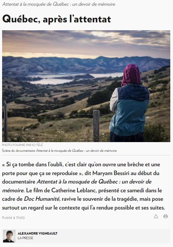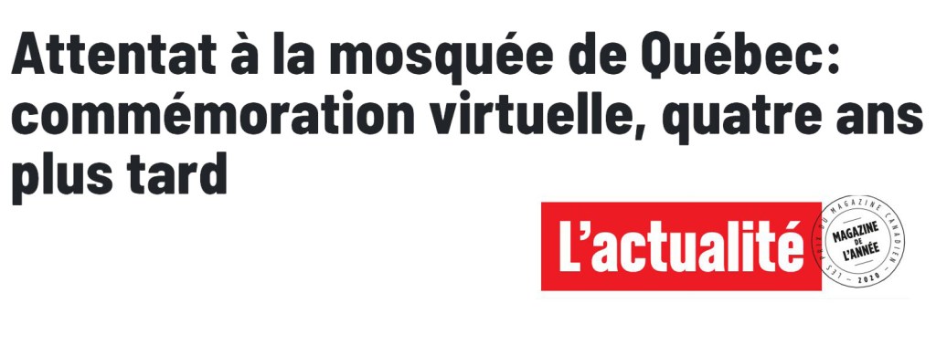 Traduction : Les lieux de culte sont censés représenter un refuge sacré contre le stress et la dureté du monde au-delà de ses murs, et pourtant, le 29 janvier 2017, la tranquillité qu’on y voyait a été détruite par la haine, par l’islamophobie. Et maintenant, nous marquons le passage du temps, sept ans depuis que la peur, l’ignorance, la diabolisation et l’extrémisme violent détruisent la vie de tant de familles et choquent notre pays jusqu’au cœur. (…)