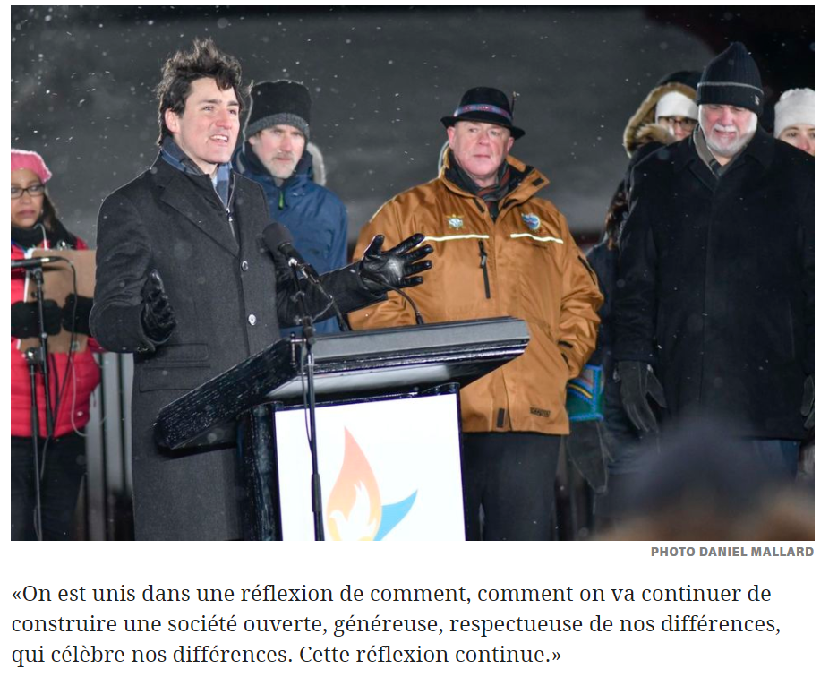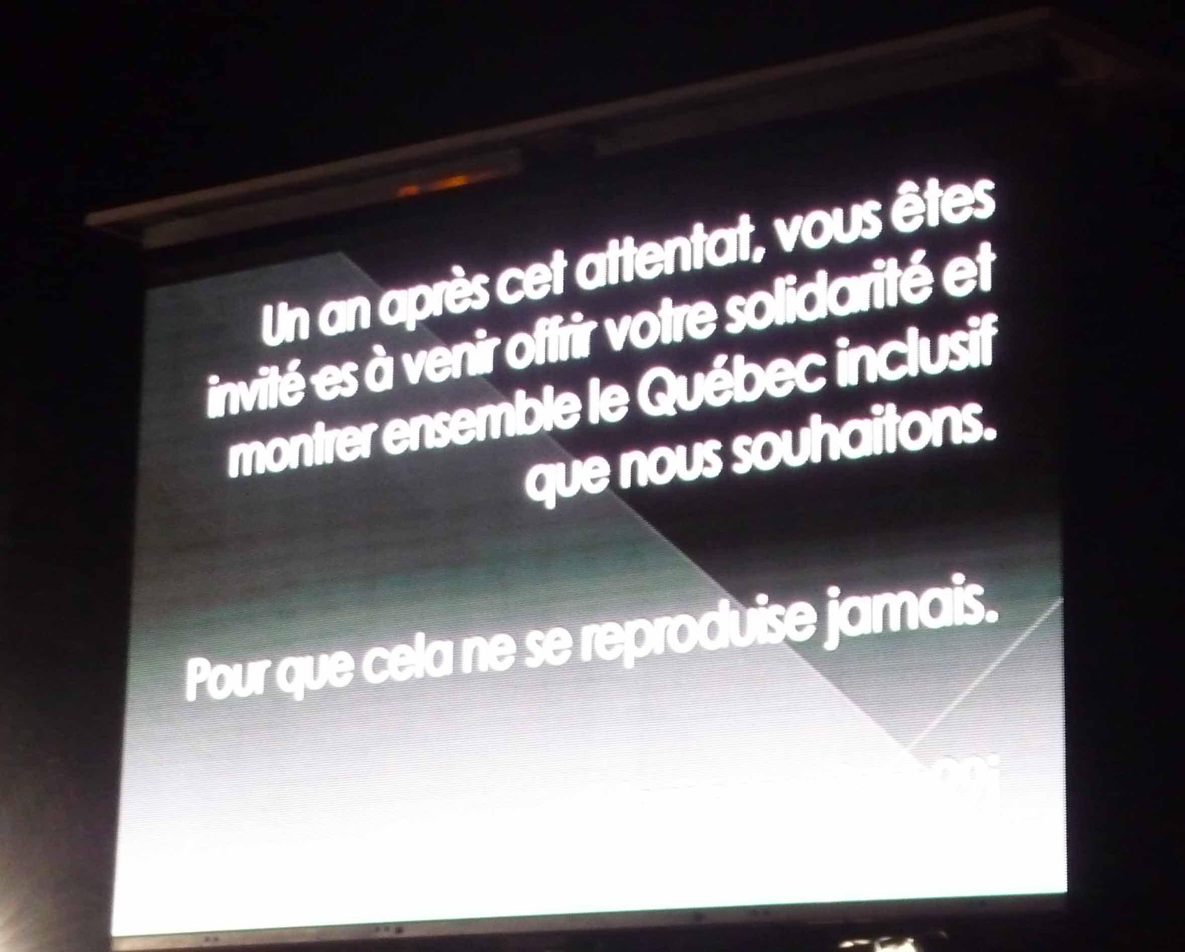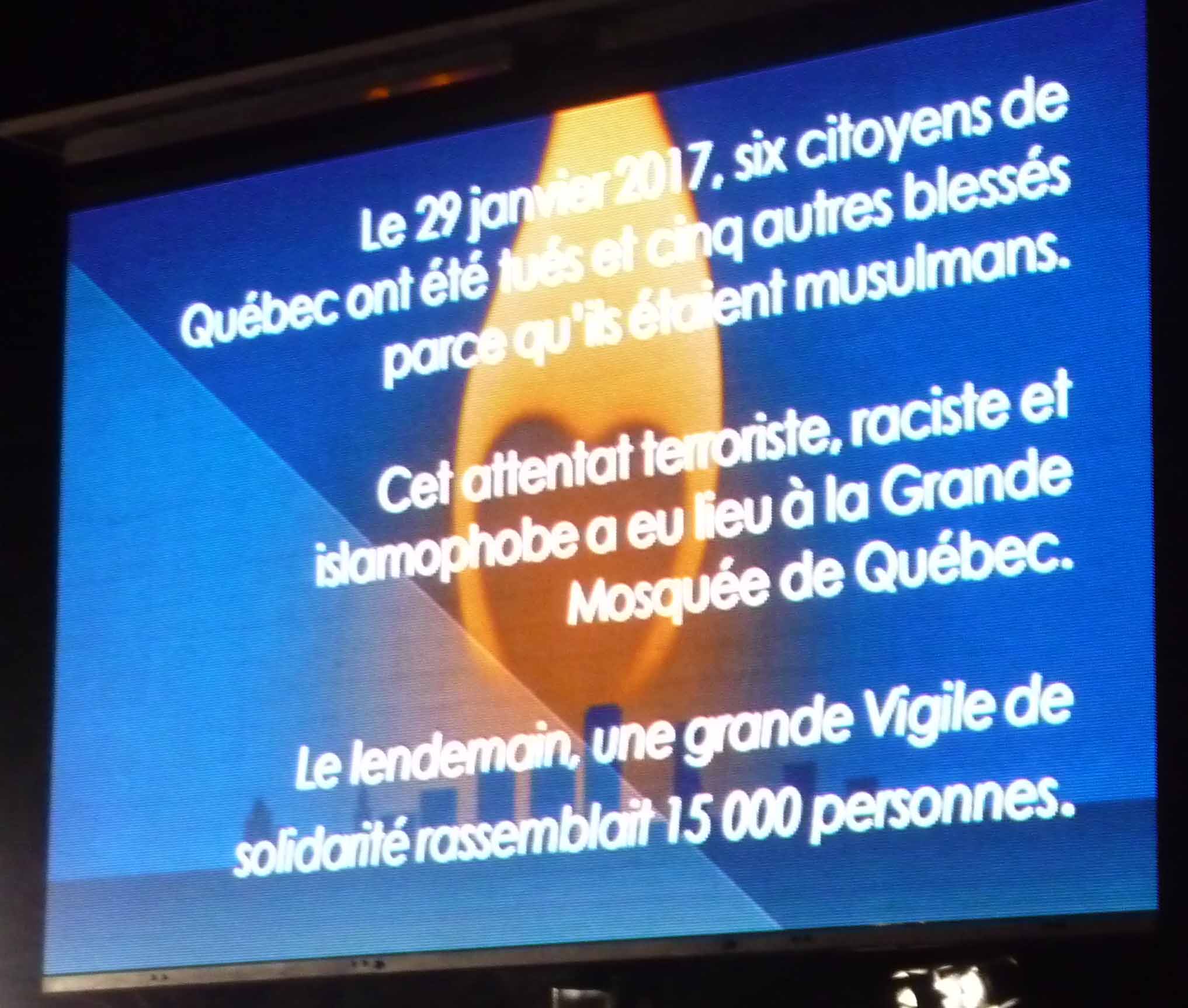 À l’invitation du comité citoyen composé de plus de 50 bénévoles, je représentais avec Heidi Rathjen le regroupement PolySeSouvient. Nous nous sommes adressés brièvement aux 300 convives qui s’étaient rassemblés dans l’église Saint-Mathieu de Québec transformée pour l’occasion en une grande salle de convives pour souligner la 3e commémoration du drame de la mosquée de Québec.