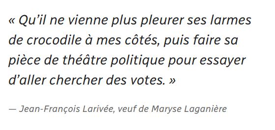 Nathalie Provost, une survivante de la tuerie, en rajoute : Pour moi, il n’est plus le bienvenu là. Je n’irai plus le saluer. Je n’accepterai plus ses bons mots de condoléances ou de sympathie […]. Pour moi, ça devient de l’hypocrisie de le répéter fois après fois et de ne pas faire les gestes qui sont efficaces.