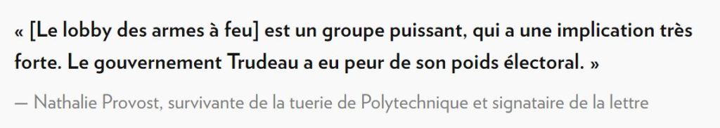 Pour Mme Provost, qui milite depuis des années pour l’interdiction des armes d’assaut, « le puissant lobby des armes à feu a fini par gagner ».