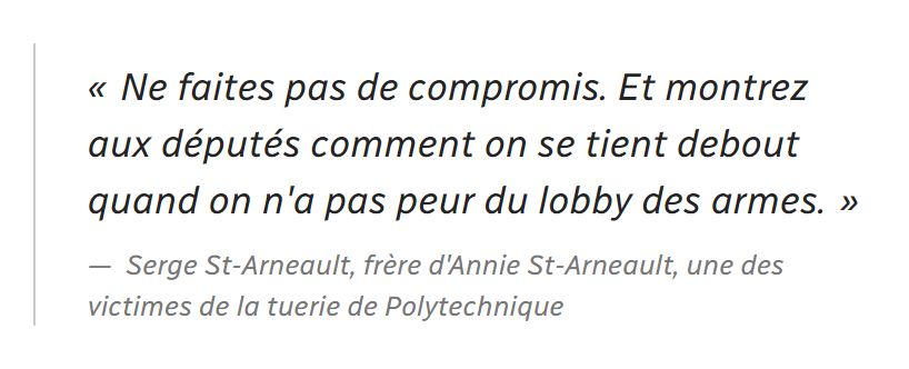«Ne faites pas de compromis. Et montrez aux députés comment on se tient debout quand on n’a pas peur du lobby des armes», a plaidé M. St-Arneault.